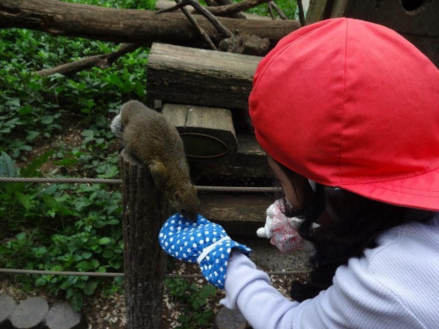 天気が心配でしたが、ちょうどよい気候で遠足へ行くことができました。リス園では、リスにえさやりをしたり、リクガメやウサギ、モルモットなどのいろいろな生き物を見たりしました。子どもたちは時間をかけてえさやりをして、じっくり観察をしていました。