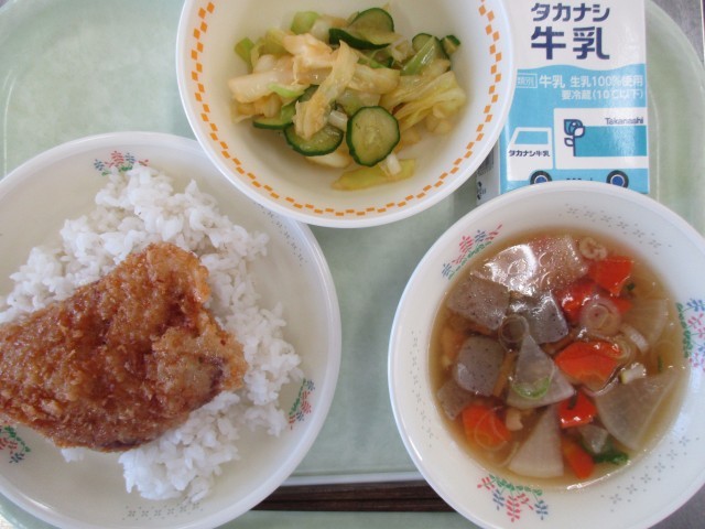 牛乳タレかつ丼キャベツときゅうりの甘酢和えのっぺい汁