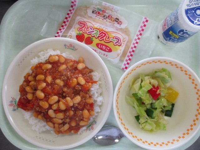 発酵乳チリコンカンライスカラフルサラダいちごクレープ