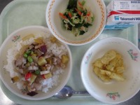 学校給食は明治22年に山形県で始まったと言われています。その時のメニューはおにぎり、焼き魚、漬物だったそうです。給食週間初日の今日は、始まりの給食の再現の予定でしたが、感染症予防のため、おにぎりをご飯と海苔の佃煮に変更させていただきました。