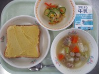 えびピラフ フレンチサラダ 大豆入り野菜スープ 牛乳