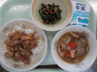給食では、ドレッシングも手作りをしています。少しずつ材料を変え、色々な味のドレッシングを作ります。今日は玉ねぎを使ったドレッシングです。お酢、レモン汁、油、砂糖、塩などの調味料と玉ねぎを一緒にミキサーにかけました。ミキサーにかけることで、調味料と玉ねぎがきれいに混ざり、おいしいドレッシングになります。町田産のキャベツとあえて、コールスローサラダにしました。