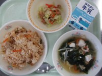 牛乳菜飯キャベツのレモン醬油里芋のそぼろ煮りんご