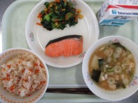 牛乳にんじんごはん鮭の塩焼き小松菜サラダじゃがいもと豆腐のみそ汁