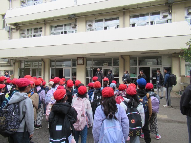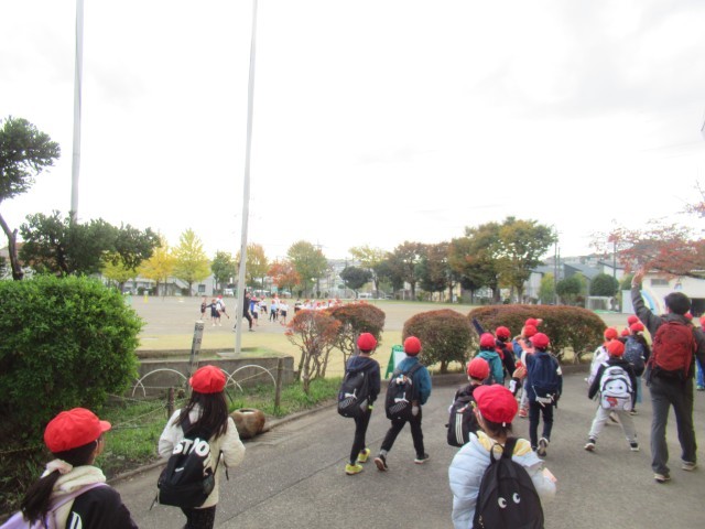 校庭で体育をしていた3年生からも「気をつけていってらっしゃーい!」と