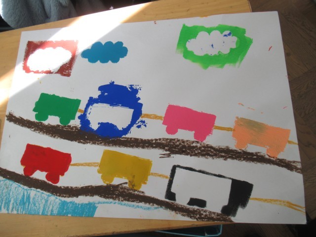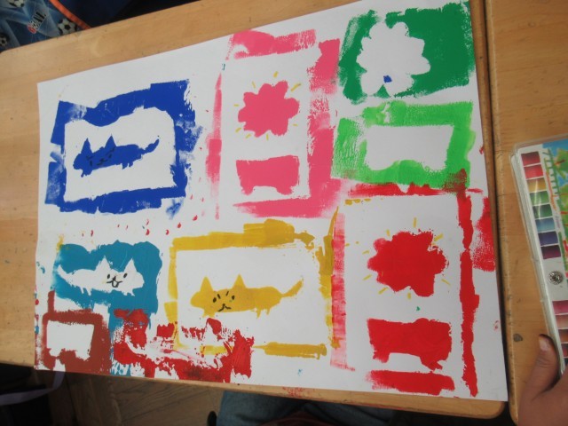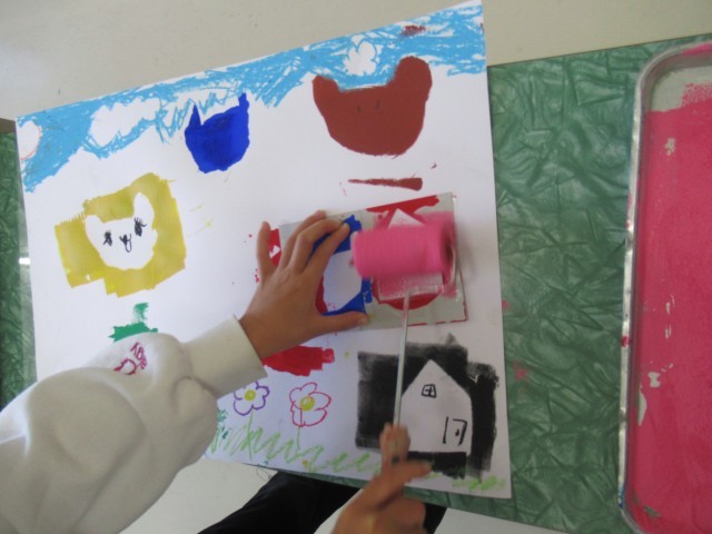 それぞれの形を描いて、ローラーで絵具をつけて絵を完成させます。