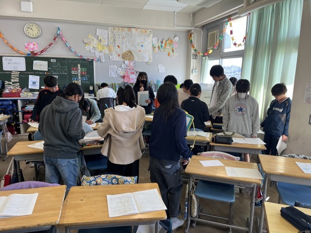それぞれのノートを机に置いて、出たり入ったりしながら友達の学び方を学んでいます