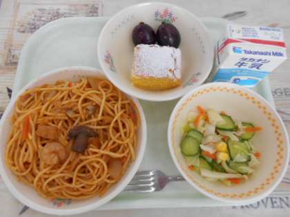 今日の献立は、牛乳 スパゲティペスカトーレ コーンサラダ 米粉のかぼちゃケーキ ぶどうです。