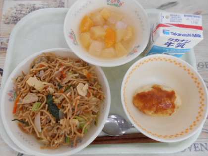 今日の献立は、牛乳 塩やきそば じゃがいもの五平もち こんにゃくゼリー入りフルーツポンチです。