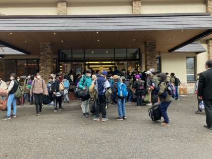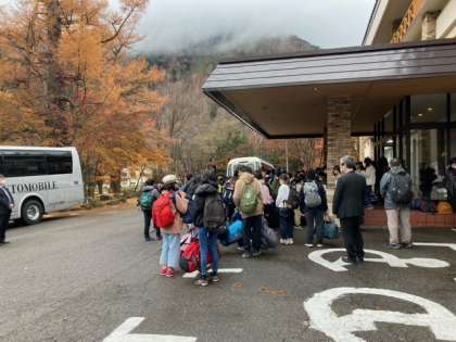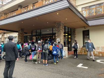 ホテルに到着です。開校式の後、ふくべ細工と源泉見学に行きます。