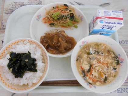 今日の献立は、牛乳 ご飯 わかめのナムル つくねの和風あんかけ