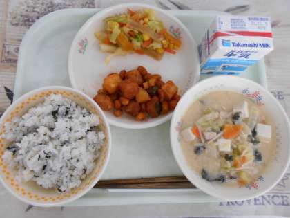 今日の献立は、牛乳 キビ入りわかめご飯 かつおとポテトの変わり揚げ カラフルこんにゃくサラダ 飛鳥汁(あすかじる)です。