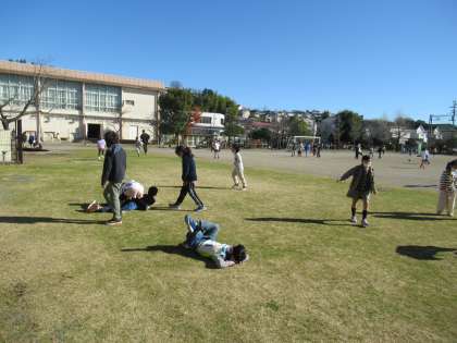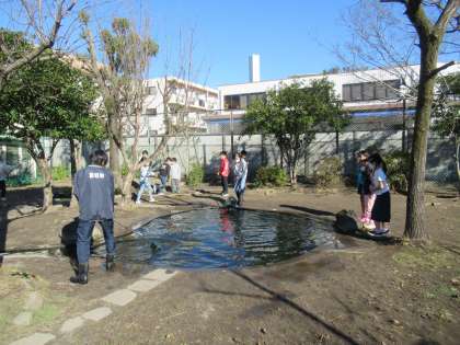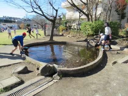 天気もよく大勢の子が外で遊んでいました。環境委員会の子供たちは池の掃除をしていました。