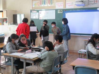 5年生の外国語の様子です。先生方へインタビューしたことをクイズ形式で発表します。その練習をしていました。