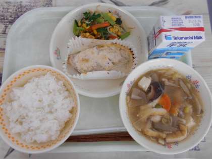 今日の献立は、牛乳 ご飯 しいらのアーモンド焼き 小松菜サラダ のっぺい汁です。