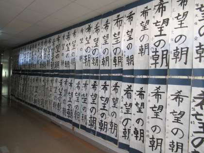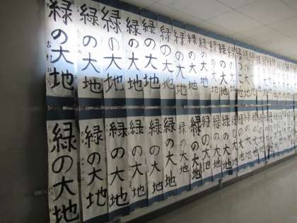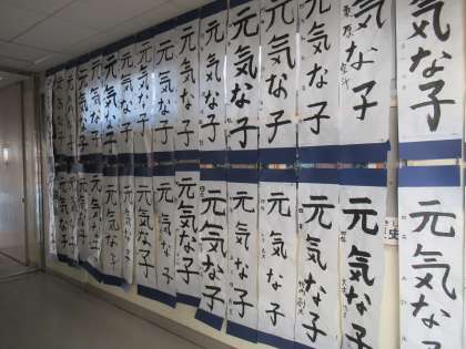 子供たちが書いた書き初めを展示しています。渡り廊下には、4・5・6年生の作品を展示しています。