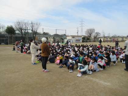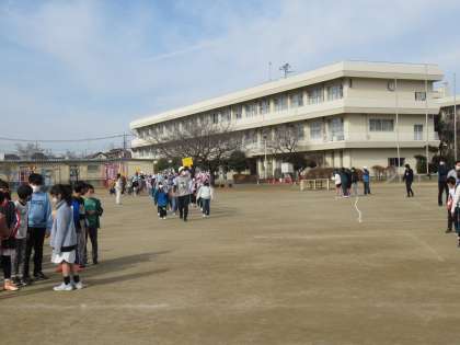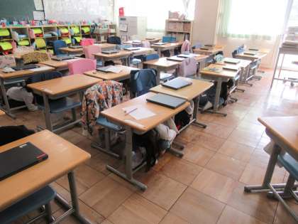 中休みに地震を想定舌避難訓練を実施しました。休み時間ですので、教員が近くにいない場合もあります。様子を見ていると、教室にいる子供たちは、すぐ机の下に入っていました。校庭で遊んでいた子供たちは、すぐに座り、放送を聞いていました。