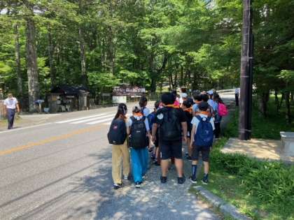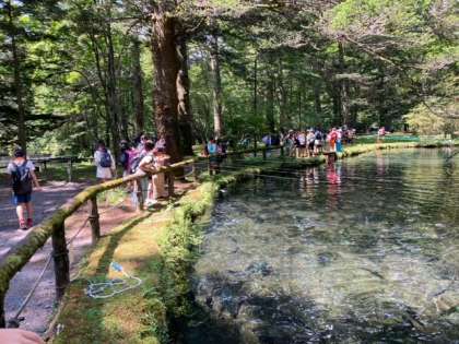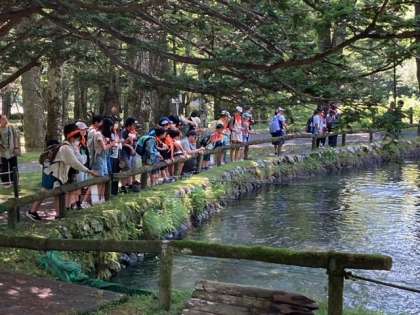 さかなと森の観察園でニジマスにえさをあげました。