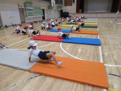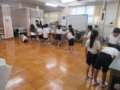 2年生の体育の様子です。いろいろな動物のまねっこ遊びをしていました。