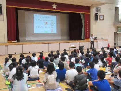 4年生は、昨年度から2年間、都立町田の丘学園との交流を行っています。本日は、町田の丘学園の先生に来ていただき、障害理解についてと町田の丘学園の様子について話をしていただきました。12月に直接交流を町田の丘学園を訪れて行います。