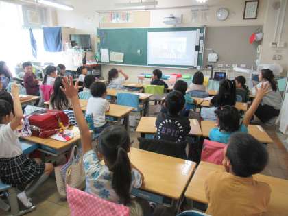 10月18日(水)ゲーム集会 公開日 2023/10/18 更新日 2023/10/18 お知らせ 本日の集会は、ゲーム集会でした。事前に動画をとって、流しました。 内容はクイズで、誰が座っている真似をしているか、片足で立っているのは誰か、重いバケツを持っているのは誰かなどで、子供たちはその様子を見ながら、誰が正解かを考え、手を挙げていました。