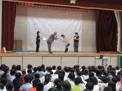 11月6日(月)全校朝会 公開日 2023/11/06 更新日 2023/11/06 お知らせ 全校朝会で、海外に派遣されている教員が現地の様子を写真や動画で送ってくれたので、その様子を紹介しました。現地の小学校の様子や朝食の様子など、日本とは全く違う風景に子供たちは驚いていました。 読書感想文で優れた感想文を書いた児童の表彰も行いました。