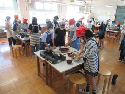 6年生の家庭科の様子です。調理実習でした。ジャーマンポテトと白玉だんごを作っていました。