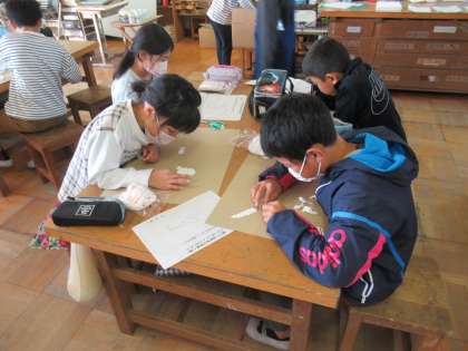 4年生の図工の様子です。絶滅した幻の生物の骨格を粘土で表すという学習です。下書きをもちに、粘土を貼り付けていました。