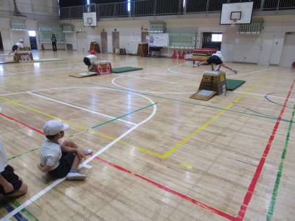 1年生の体育の様子です。跳び箱遊びを行っていました。腕をついて、跳び箱に乗る動きを楽しんでいました。