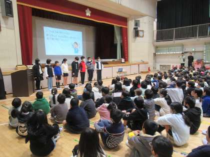 全校朝会では、校長先生は人権週間について話をしました。ふれあい月間に続いて、一人一人が楽しく学校に来られるように、相手のことを考えて学校生活を送りましょうと話しました。