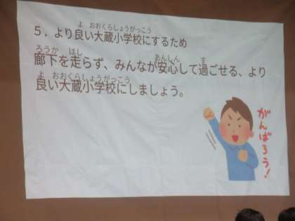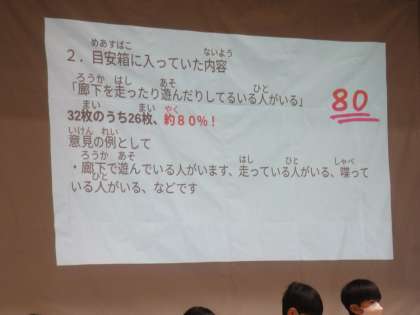 代表委員会から、目安箱に寄せられた意見を集約して、廊下歩行の仕方について話をしました。代表委員会児童の呼びかけに、子供たちもうなずきながら話を聞いていました。