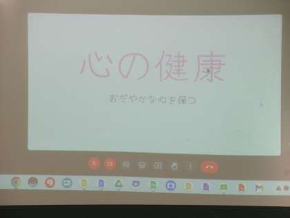 12月13日(水)保健委員会発表集会 公開日 2023/12/13 更新日 2023/12/13 お知らせ 本日の集会は、保健委員会の発表集会でした。 こころの健康というテーマでスライドを使って話をしていきました。 リラックスしたり、前向きな考え方を身につけたりすることで、自分をかけがえのない存在であると思うようにしましょうという話でした。