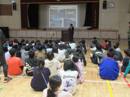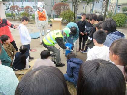 5年生が市役所の防災課や地域の方たちに来ていただき、防災教育の出前授業を行いました。体育館で防災について話を聞いた後、非常用トイレや照明装置を見学したり、テントを立ててみたりしました。