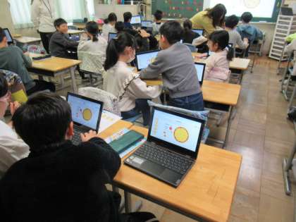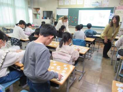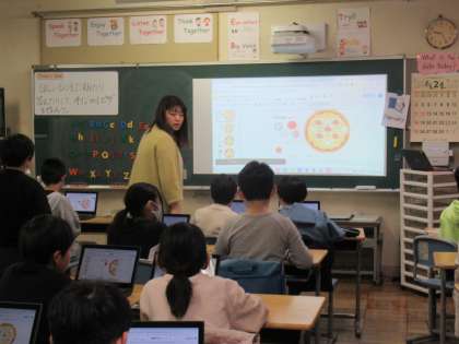 4年生の外国語活動の様子です。食材の言い方や欲しいものを尋ねたりする活動でした。ピザの具材を何にして、いくつ欲しいかを2人で尋ねあいながら学習していました。