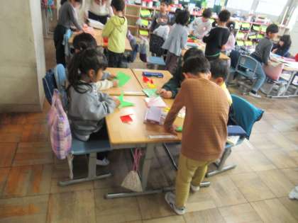 1年生が新1年生の教室の飾りで使う作品を作っていました。