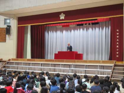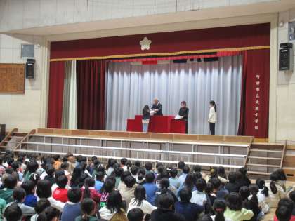 修了式を行いました。各学級の代表児童に終了証を渡しました。皆さん、1年間よく頑張りました。校長先生は、卒業式に5年生が在校生代表として立派に参加したことなどを話しました。
