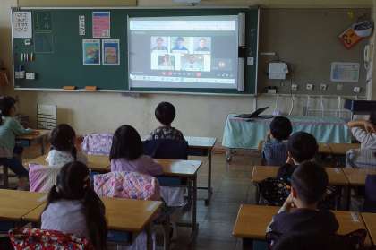 今日の朝の時間はオンラインによる「先生クイズ」
