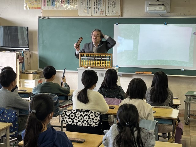 地元でそろばん教室を営む「もんじゅ先生」が大蔵小学校に来校