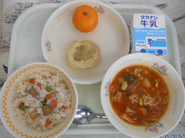今日の給食は、牛乳 ウィンナーピラフ ツナポテチーズ焼き 青大豆入りミネストローネ みかんです。