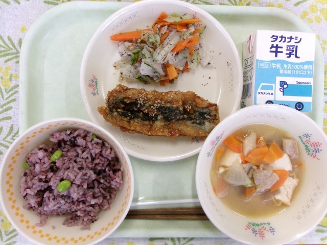 ごはんは黒米と枝豆をつかい、萩の花をイメージしました。黒米ごはんを初めて食べる子もいたようです。