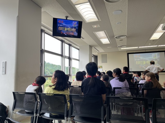 ダムの横にあるレクチャーセンターでダムのお話を聞いてます。学校での学習につながります。