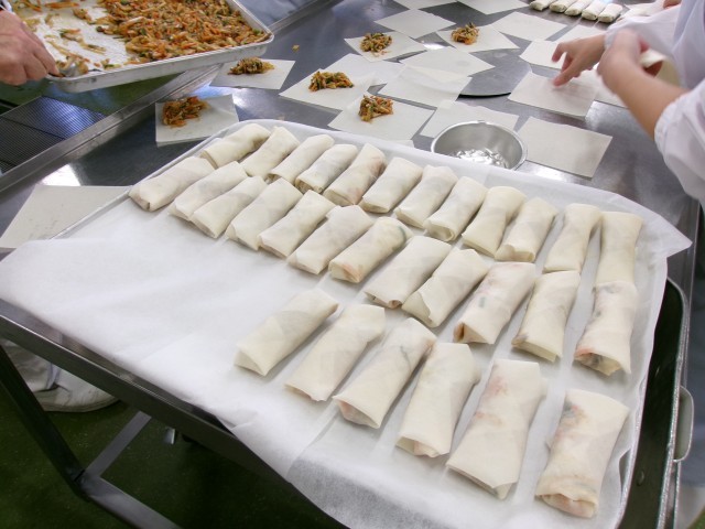 焼き春巻きはひとつひとつ調理員さんが巻いています。油を塗って焼いているため、パリッとした食感になります。