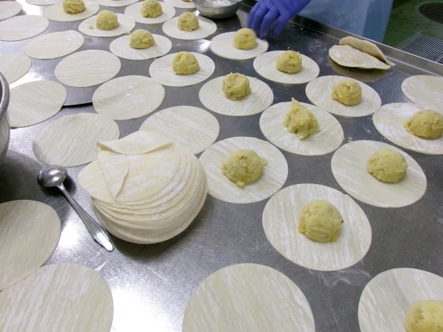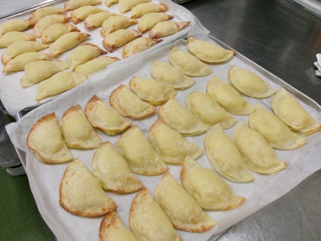 さつまいもとりんごのぎょうざパイは、蒸したさつまいもとりんご缶を合わせた具をぎょうざの皮で包んで焼きました。