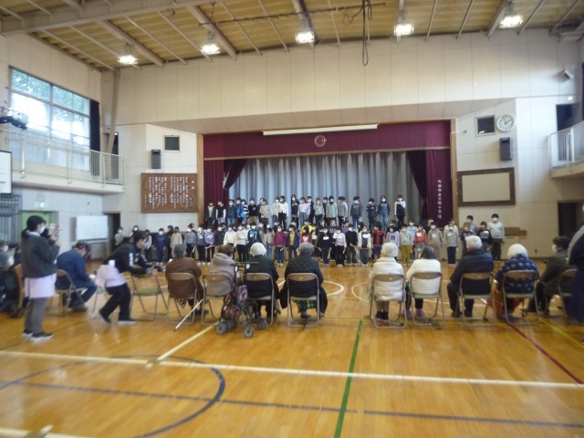地域のデイサービスを利用していらっしゃるみなさんが三輪小に来てくださいました。子どもたちの歌や合奏で歓迎しました。その後、グループごとに別れ、一緒にゲームなどを楽しみました。