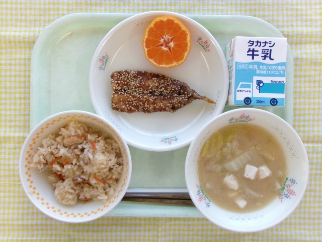 節分にちなみ、煎り大豆を炊き込んだごはんといわしのかば焼きを提供しました。