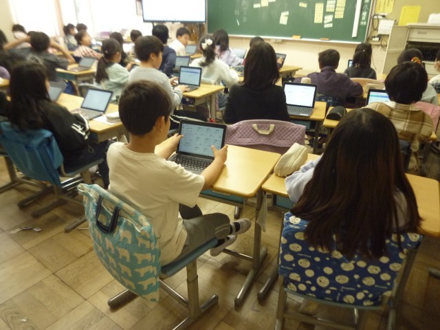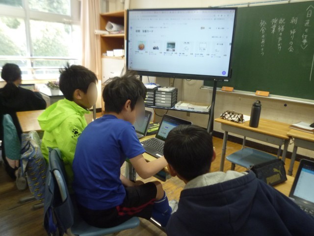 自己紹介カードや係活動カードをデジタル機器を使って作成しています。友達と一緒に編集したり、共有したりすることが楽しそうです。