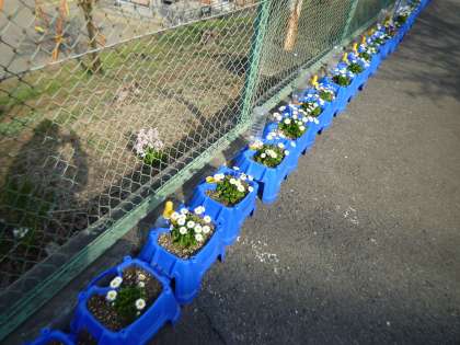 1年生の入学のために育てていたパンジーやノースポール。このあたたかさで一斉に花をたくさん咲かせました。校舎までの道が華やかです。