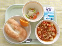 ~1月16日の献立~・牛乳・きなこ揚げパン・トマトシチュー・ビーンズサラダ・果物...