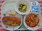 今日の献立 牛乳 ガーリックトースト ポークビーンズ 野菜とわかめのサラダ 果物...