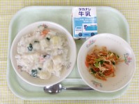 ~11月13日の献立~・牛乳・クリームライス・揚げじゃがサラダ今日は、サラダの中でも人気のある「揚げじゃがサラダ」です。千切りにしたじゃがいもを揚げて、サラダにのせています。じゃがいものカリっとした食...